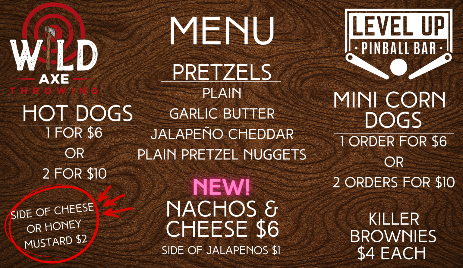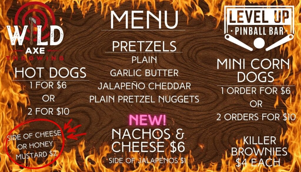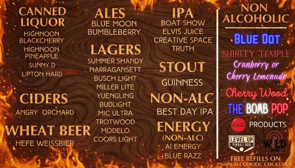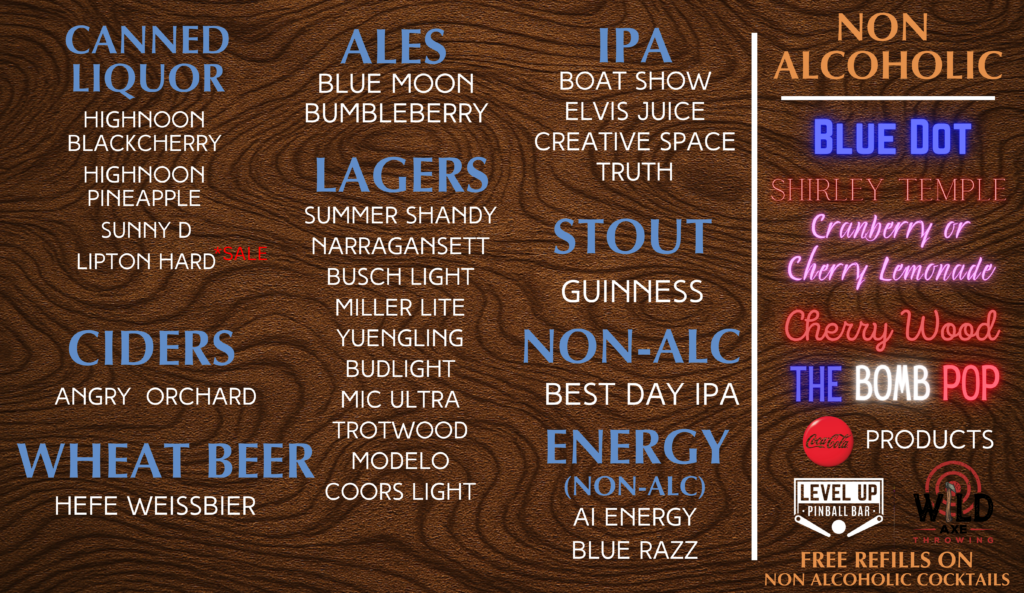 Wild Axe Throwing is connected to Level Up Pinball Bar. Come check out our state of the art pinball tables and arcades while you wait for your party arrive.